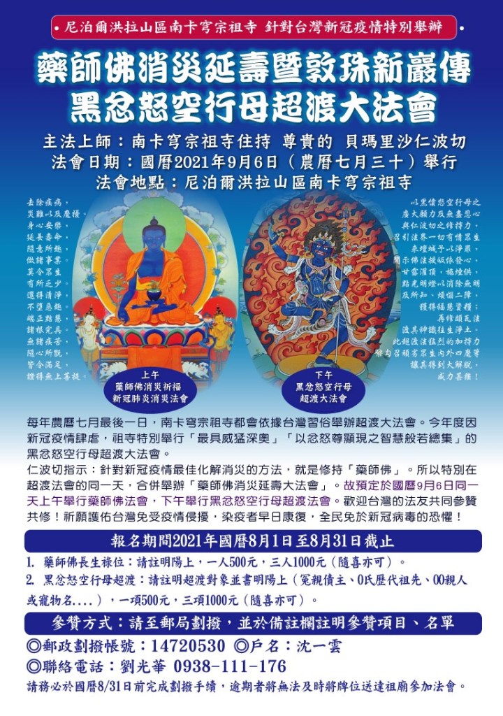 2021/09/06 藥師佛消災延壽暨敦珠新巖傳黑忿怒空行母超度大法會 namkhyung / 2021-07-13 2021/09/06 上午 藥師佛法會實況照片 2021/09/06 下午 黑忿怒空行母超渡法會實況照片 分享此文: 按一下以分享至 Facebook(在新視窗中開啟) Facebook 按一下即可分享至 X(在新視窗中開啟) X 更多 按一下即可以電子郵件傳送連結給朋友(在新視窗中開啟) 電子郵件 點這裡列印(在新視窗中開啟) 列印 喜歡 正在載入...