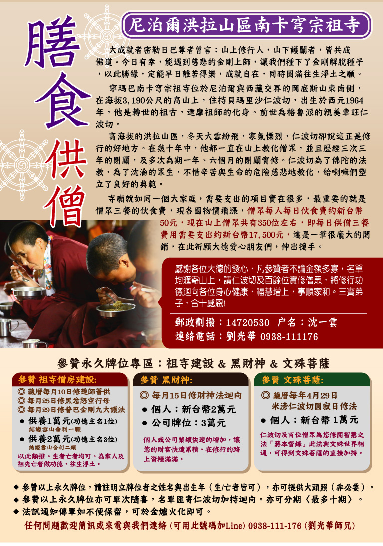 護持南卡穹宗祖寺百位實修僧眾膳食法糧